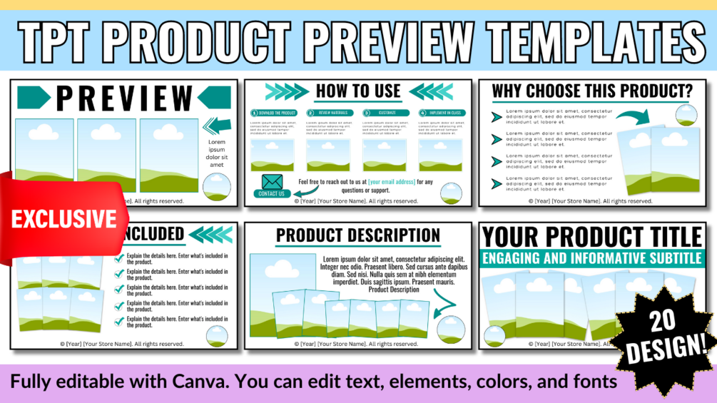 ستحصل على 20 قالب احترافي وسهل التعديل لمعاينة المنتجات التعليمية
