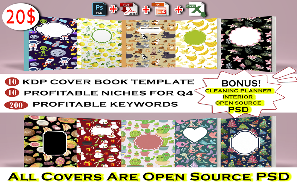 You'll Get 10 KDP Cover Design (PSD File), 10 Niches, 200 Keywords, and a Cleaning planner interior (PSD File)